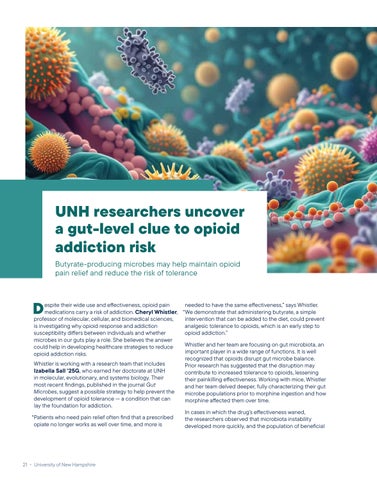 Whistler is working with a research team that includes Izabella Sall ’25G , who earned her doctorate at UNH in molecular, evolutionary, and systems biology. Their most recent findings, published in the journal Gut Microbes, suggest a possible strategy to help prevent the development of opioid tolerance — a condition that can lay the foundation for addiction.