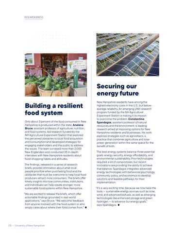 New Hampshire residents have among the highest electricity costs in the U.S., but belowaverage reliability. An emerging UNH research program funded by the NH Agricultural Experiment Station is making it its mission to overcome the problem. Constantine Spandagos, assistant professor of natural resources and the environment, is leading research aimed at improving options for New Hampshire residents and businesses. His work explores strategies such as agrivoltaics, a practice that combines agriculture and solar power generation within the same space for the benefit of both.