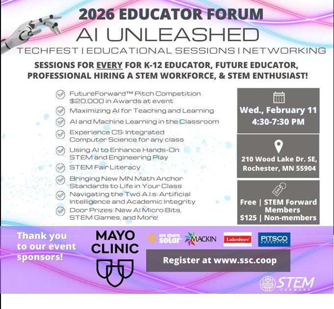 Five southeast Minnesota educators were nominated for the 2025-2026 Outstanding Educator Award hosted by STEM Forward (formerly RAMSP), which recognizes K-12 professionals who strive toward the highest levels of science, technology, engineering, and math (STEM) excellence within their schools and community, with a focus on initiative and continuous improvement in every aspect of their work.
