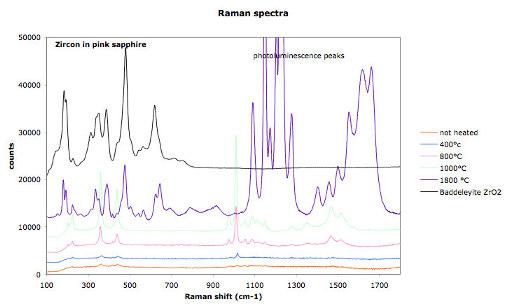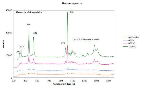 Raman spectra show the effect of heat treatment on the cristallinity of zircon inclusions in pink sapphires (from Ilakaka, Madagascar).