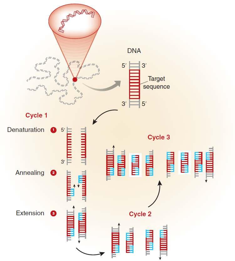 • DNA amplification involves using short DNA sequences (primers) to select the portion of a genome for amplification. In PCR, sample temperature is repeatedly increased and decreased to help a DNA replication enzyme synthesise the target DNA sequence.