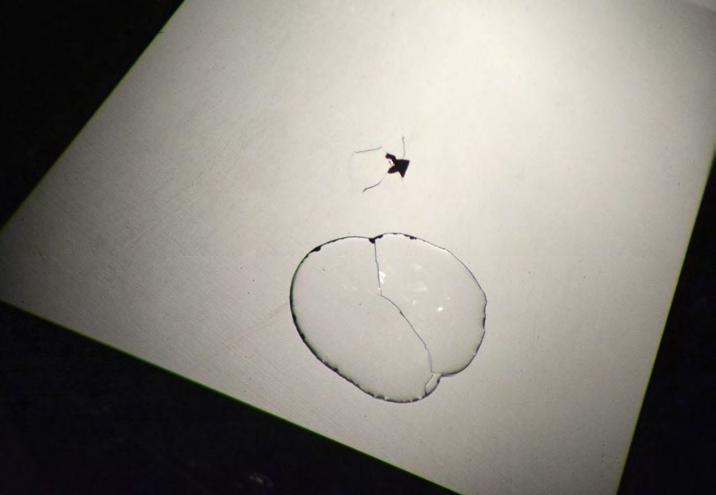 Thorianite (ThO2) or other radioactive inclusion near the surface may result in a (small) chipping damage as a consequence of the decay of U to Pb over (geological) time periods.