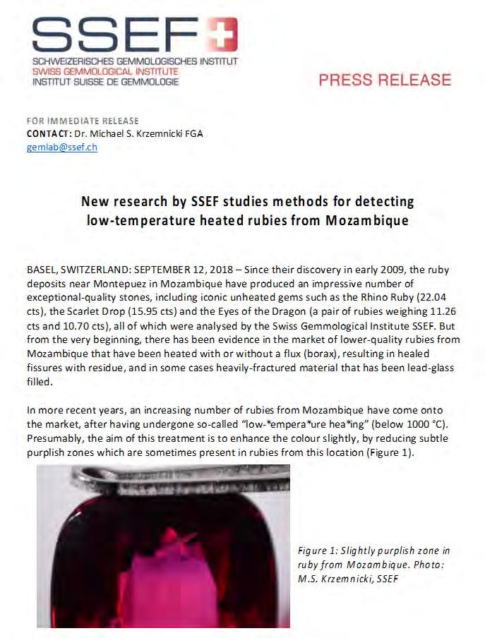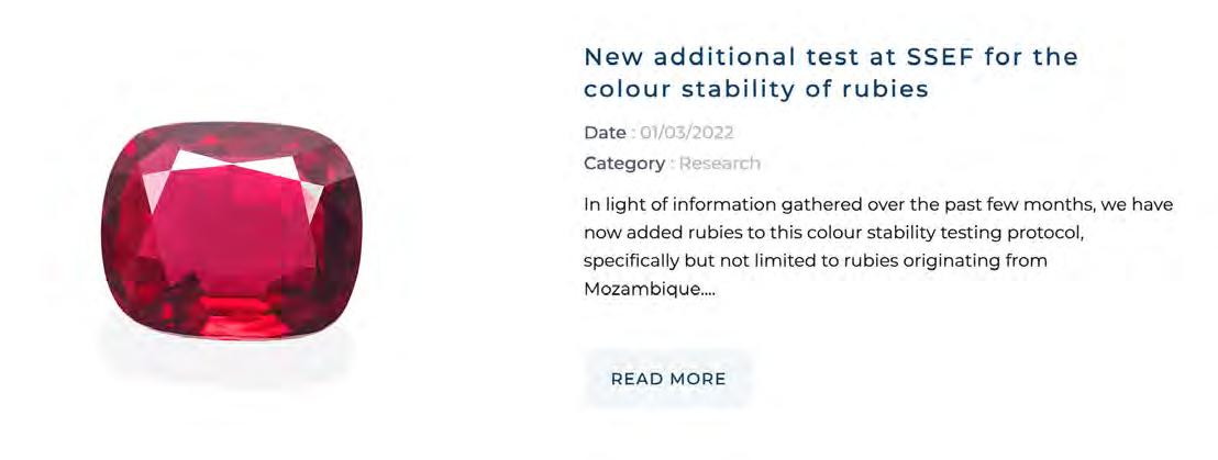 • SSEF colour stability testing on many hundred Mozambique rubies: We never observed a ruby with colour instability.