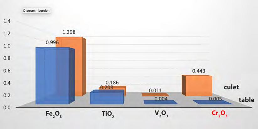 Chromium-rich zone at the culet (reddish) and chemical composition at table facet (blue bars) and culet (orange bars).