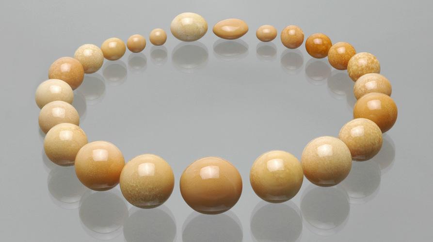Nephrite consisting mainly of Mg-rich tremolite is white. Such white nephrite from Xin Jiang (Hetian Prefecture) is highly adorned in China as so-called“mutton-fat”jade.The more iron (actinolite compound) substitutes for magnesium, the more green the colour of nephrite. Nephrite often contains further minerals in minor quantities such as chromite, magnetite, and talc. Fe-oxides and hydroxides along grain boundaries and microfractures lead to yellowish to brown nephrite. Nephrite is found in many places worldwide, with important and classic deposits in China such as the Yurungkash river (“white jade” river) in the Hetian Prefecture of the XinjiangUygur Autonomous Region, and the Yuku peak in the Quinghai Province (Qinghai Jade) for green nephrite. Other historically important sources of nephrite are found around the Tarama-