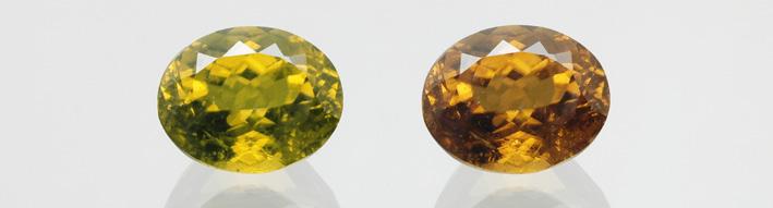 Colour-change from yellowish-green (daylight, left) to brownish-red (incandescent light, right) of a bastnäsite (8.82ct) from Zagi Mountain,Pakistan.