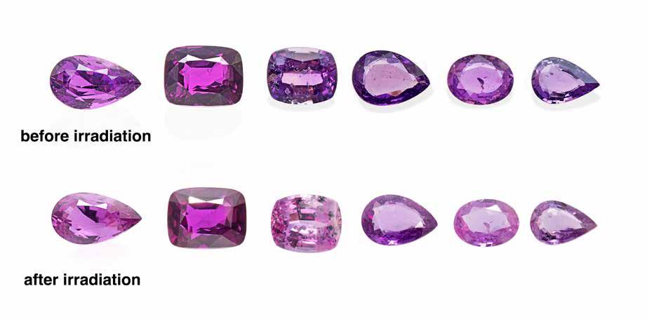 r Figure 1: Unheated (left) and heated (right) gemstone pairs indicating the colour change intended by a heat treatment. Starting material in the upper row is greenish blue aquamarine (left), amethyst (middle) and purple Cu-bearing tourmaline. Starting material in the lower row is greyish ‘geuda’ sapphire, purple sapphire and purplish ruby. The collage of these gemstones has been digitally arranged. Photo: M.S. Krzemnicki, SSEF.