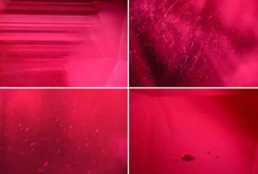 Figure 5: The lower the heating temperature, the less evident are microscopic features indicating such a heat treatment. From distinct discoid expansion features (left), through tiny and very tiny discoid features and spotty appearance of platelets in rubies heated at so-called low temperature. Microphotos: M.S. Krzemnicki, SSEF.