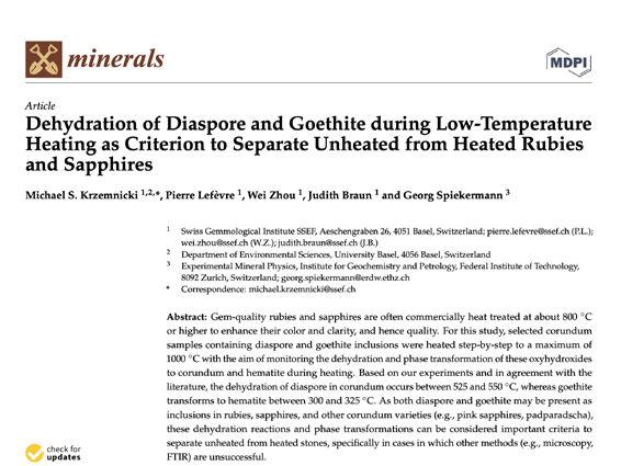 Krzemnicki M.S., Lefèvre P., Zhou W., Braun J., Spiekermann G., 2023. Dehydration of Diaspore and Goethite during LowTemperature Heating as Criterion to Separate Unheated from Heated Rubies and Sapphires. Minerals, 13(12), p.1557. https://doi. org/10.3390/min13121557