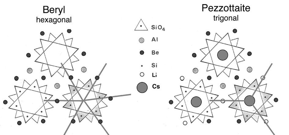These analyses revealed that large amounts of cesium and lithium are replacing part of the beryllium in the crystal structure of common beryl, giving rise to a trigonal symmetry.