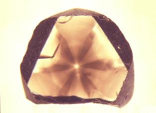 This unusal floral pattern in a diamond is due to a hydro gen-enrichment in specific growth sectors (diamond by M. Alther). © H.A. Hänni, SSEF 2003