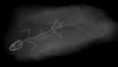 Basel, and fortunately they allowed us to examine a well-known Anolis lizard in Dominican amber (see E. Gübelin and J. Koivula, Photoatlas of Inclusions in Gemstones, ABC Edition, Zurich, 1986, p. 227). This sample displayed clear anomalous double refraction between crossed polarizers, whereas the client’s piece showed no strain in the material, around either the lizard or the numerous bubbles. Magnification revealed that the feet of the muse um’s reptile were dark brown and almost dissolved, while delicate features in the feet of the client’s liz ard were still intact. An x-radiography also produced some interesting results: While the Anolis lizard had only a weak skeletal outline, the bones and even soft tissue of the client’s lizard were clear and sharp. The latter image also showed broken bones in both upper arms, as well as the presence of fine shrinkage fissures along the length of the lizard (Fig. 2). Not being experts in amber and amber in clusions, we decided to send some detailed pictures to a specialist in the field, Dr. David Grimaldi of the American Museum of Natural History. He concluded from the submitted information that the sample was one of a number of similar mounted pieces of lizards in kauri gum from New Zealand. He reported that such pieces were known to be manufactured at the beginning of the 20th century for display by naturalists. Therefore, we reported to the client that this was a modern lizard artificially embedded in a recent natural resin.