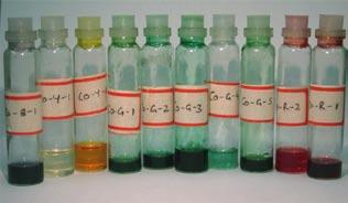 It became clear that dying substances from India are generally suspended in line seed oil, where as the Thai are using suspension in Paraffine oil. Since the dyes are strongly diluted in the solvents, the identification of the molecule is difficult.