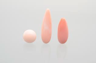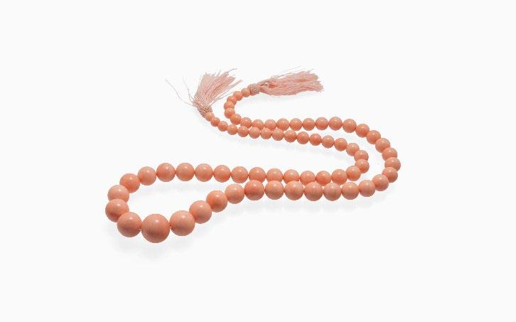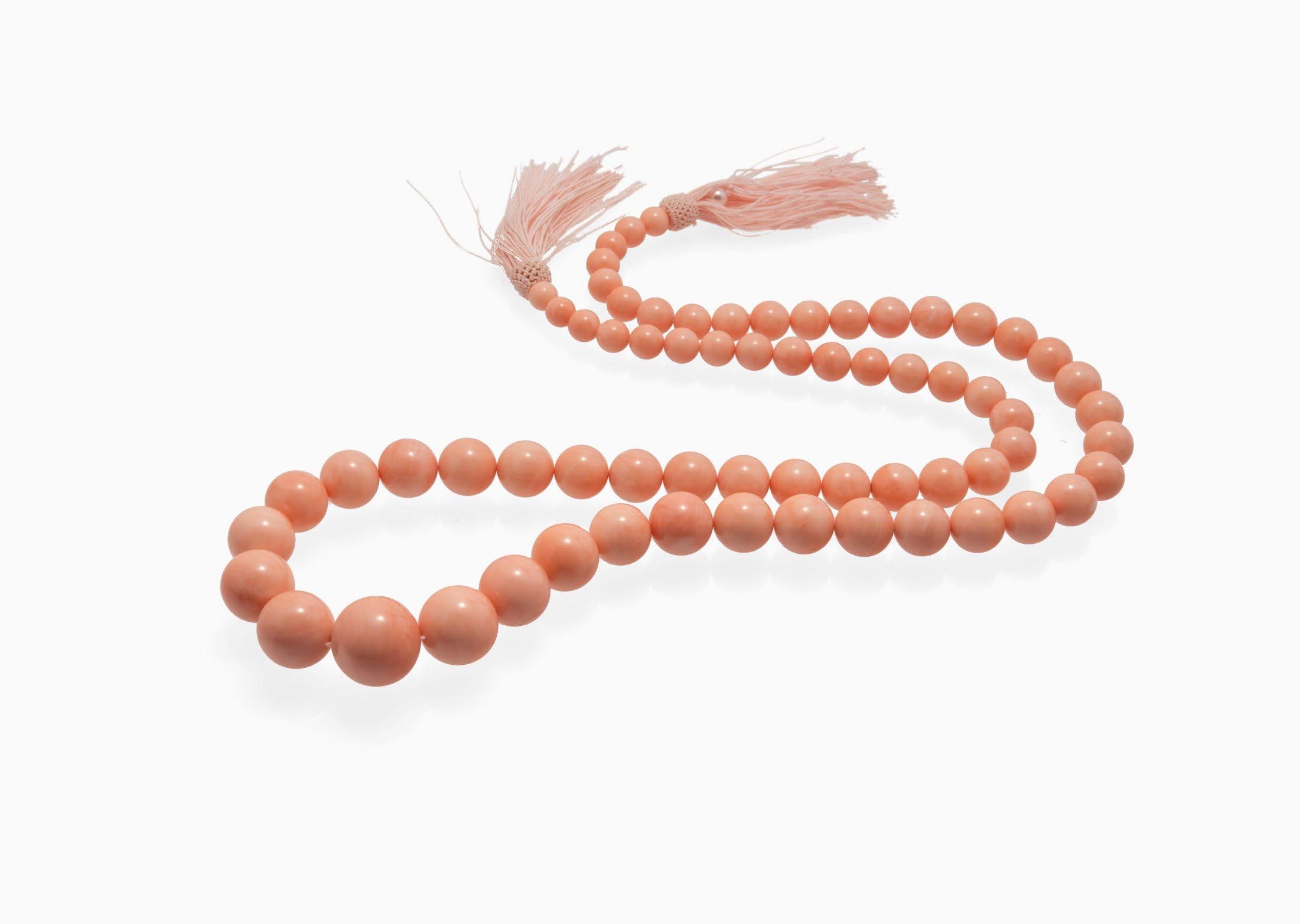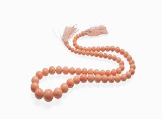 Exceptional coral strand with 67 coral beads (up to 26.75 mm) of perfectly matching colour and quality. Their subtle but attractive pink colour is poetically also referred to as ‘angelskincolour’ (boke). Such corals are commonly attributed to Pleurocorallium elatius .
