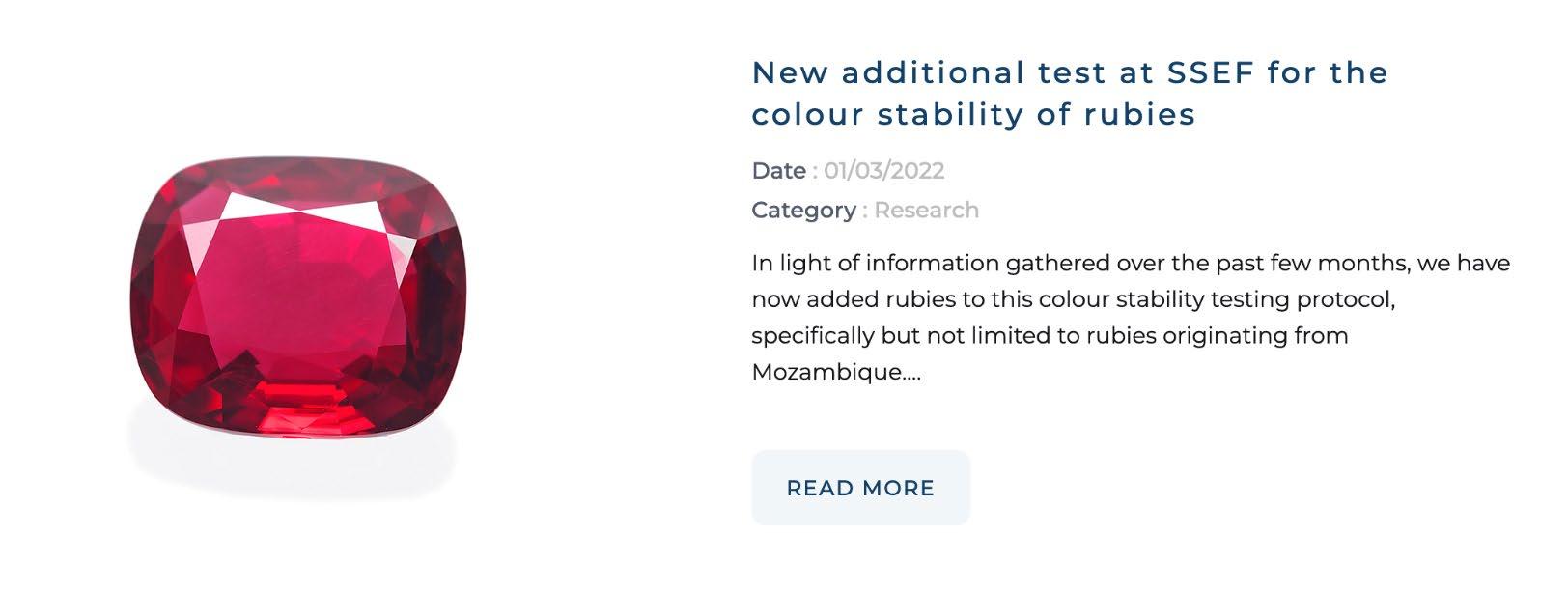 • SSEF colour stability testing on many hundred saturated red Mozambique rubies: We never observed a ruby with colour instability.
