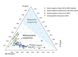 r figure 3: Mg-Fe-ti triplot showing the rather well-defined population field for Kashmir sapphires. For clarity reasons, the data of Sri lankan, East-african and Madagascar sapphires have not been plotted. it has to be underlined that they do overlap the presented population field to some extent. illustration adapted from Peucat et al. (2007) and Halicki (2013).