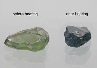 r two fragments split from one brownish green zircon from Burma before (left) and after (right) heating.