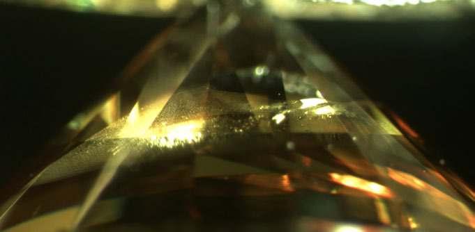 In Fig. 2 the twin plane in the pavilion region is shown. The inclusion crossing this plane is a clear indication that this feature is of natural origin – in a real doublet such a crossing would not occur as the materials making up the doublet are of different origin.