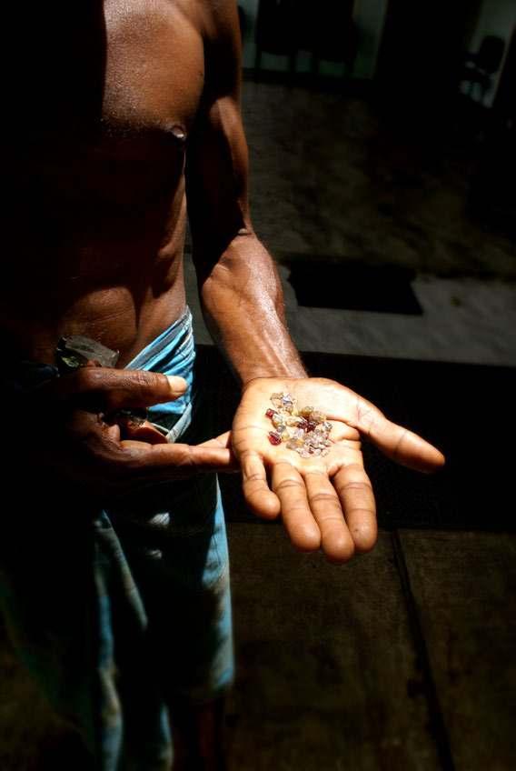 Local miner showing corundum and other rough gems in Elahera, Sri Lanka.