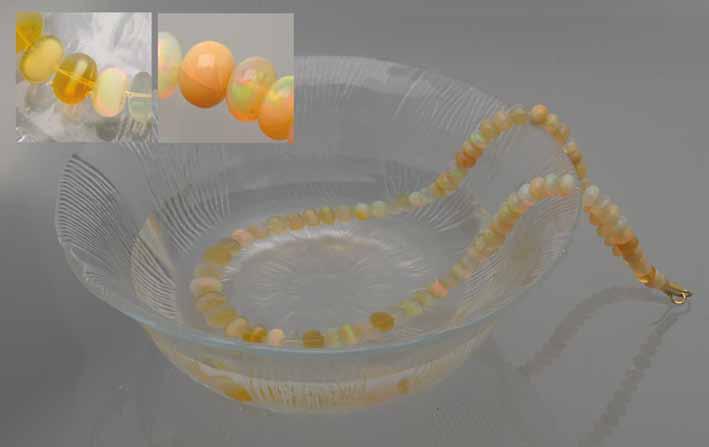 The most recent case was a necklace submitted to SSEF for analysis and description of apparent damage - including a broken opal bead -, which had occurred after the item was sold to the client. The necklace consisted of 83 button-shaped drilled Ethiopian opal beads of white to brownish yellow colour partially showing distinct play-of-colour. First, a microscopic inspection identified a few beads with incipient fracturing.
