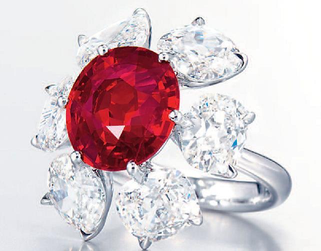 Burmese ruby of 6.04 ct set in a ring by Edmond Chin (Etcetera Ltd.), sold for a world record price of US$ 551‘000 per carat (Christie‘s Hong Kong, May 2012).
