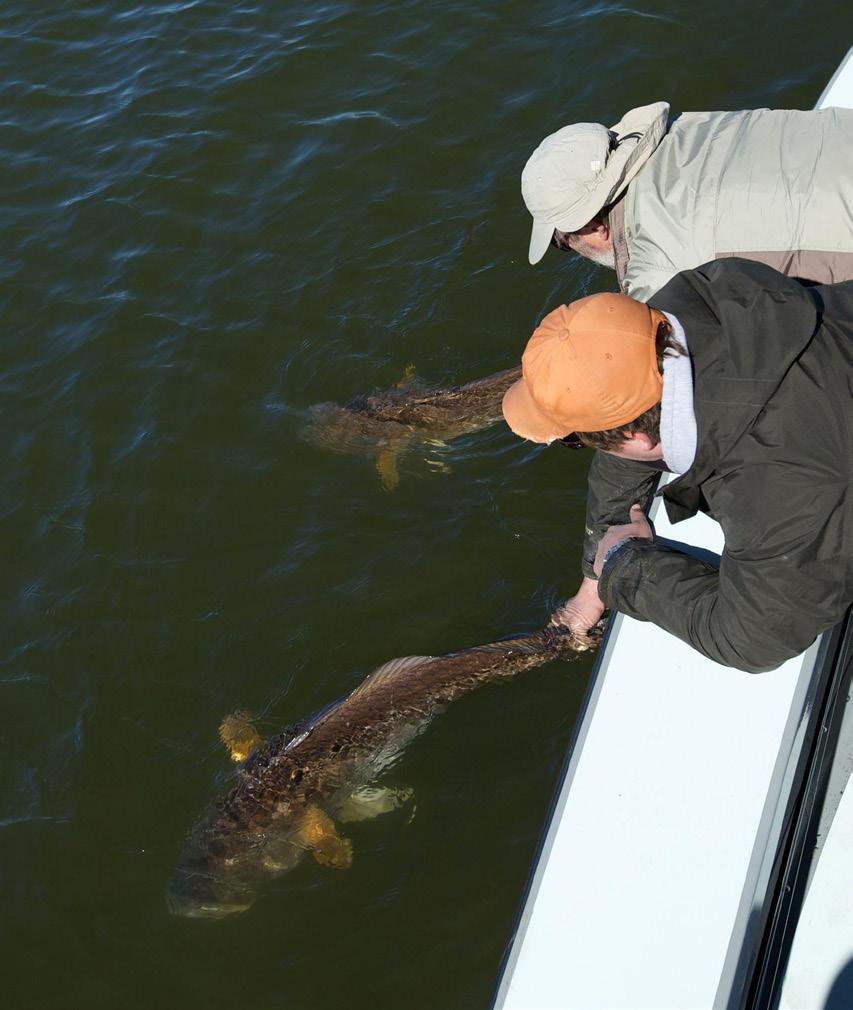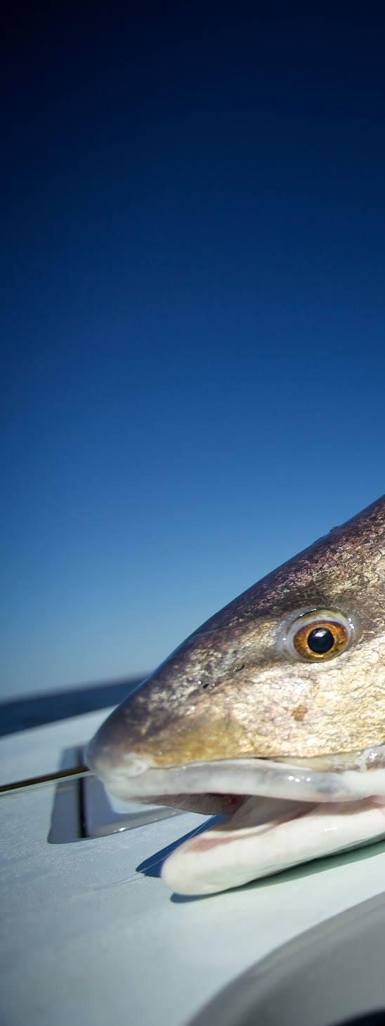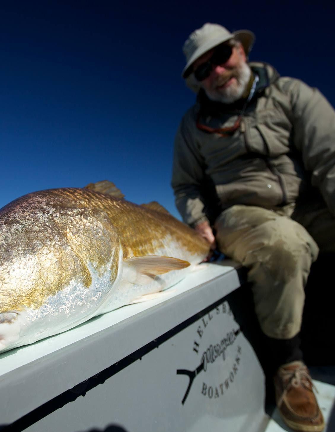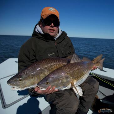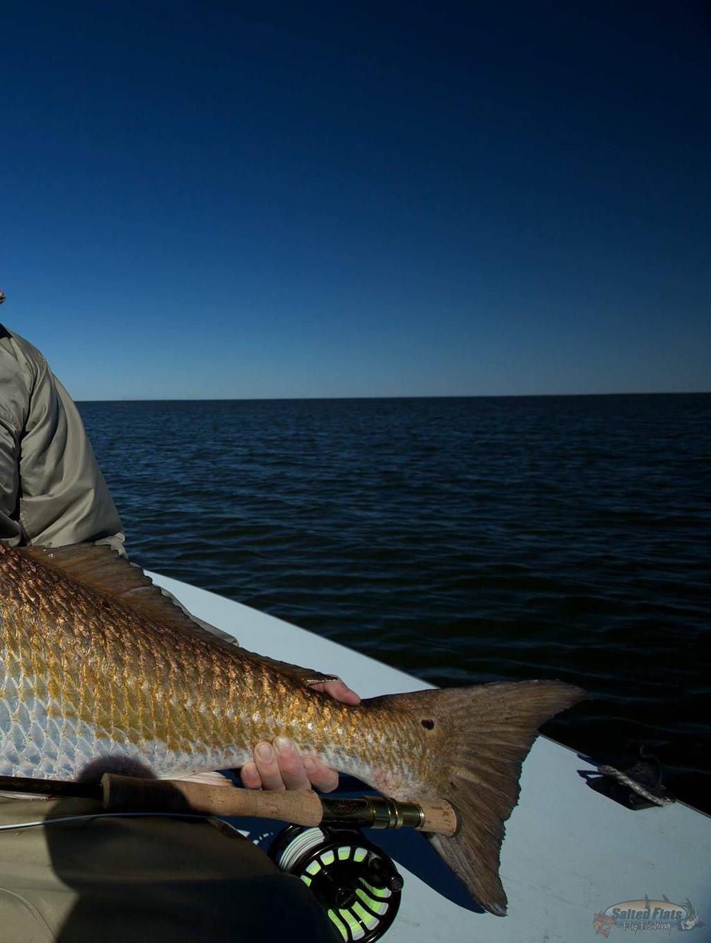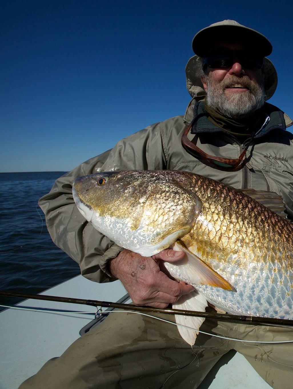 We had been anchored up for most of the day, sheltered from the wind in a little tidal creek of the back of Dauphin Island. Our frozen knuckles were busted from wailing on rat reds in a little pocket with some depth. Ticking heavy squimps across the bottom was easy, fun, and a much better alternative than fghting Jack Frost on the poling platform. Once the wind laid down, we did end up leaving our fsh to fnd more, but only connected with one. It got of.