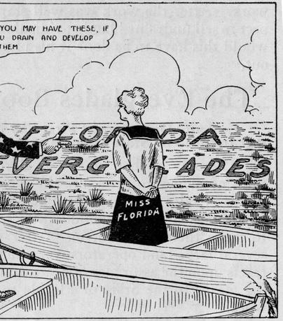 Cartoon showing Uncle Sam telling a personifed Miss Florida about the Everglades. (1916) State Archives of Florida, Florida Memory. Accessed 19 Feb. 2025.<https://www.foridamemory.com/items/ show/295324>