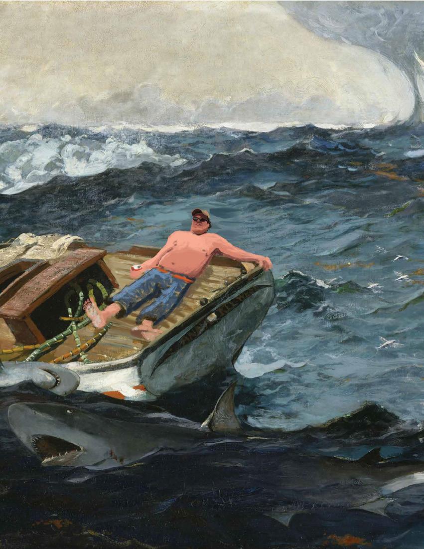The cover art for this issue is decidedly sophisticated compared with our usual fun and games here at SCOF. Winslow Homer’s The Gulf Stream has always been one of my favorite paintings by one of my favorite American artists. Although I don’t recall the frst time I saw it, I was just a kid and was mesmerized by the scene which includes a struggling boat and single crew member surrounded by sharks with a waterspout in the background. Of course, as a kid who spent summers on the Gulf (of Mexico) Coast, the sharks are what drew me in. I’m not sure if I even noticed the waterspout until I read the description of the painting while visiting New York’s Metropolitan Museum of Art many years later where it is permanently displayed. I was always focused on the absurd lunging sharks who seemed desperate for a meal. I am of the “Jaws generation” and so sharks fgured prominently in my nightmares and imagination as a boy. I grew up surf fshing of the beaches of Sanibel Island in the summer and it was a huge deal to me if/when we caught a sand shark.