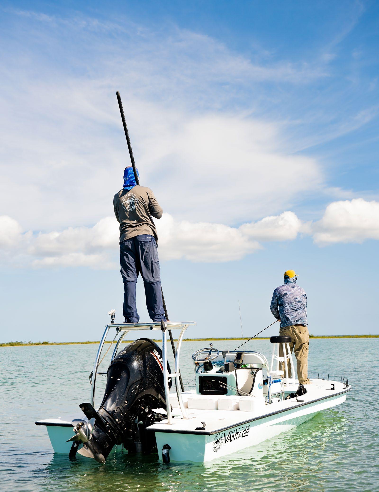 Day one on the water, we’ve yet to see a bonefish when Kurt stops poling and says, “Three permit at 9 o’clock, 60 feet.” Between the clouds and waves I can’t see them. It’s my first time on a deck fly casting to saltwater. The wind is 17 knots in our face and I’m casting like it’s a trout stream, high and pointless, crumpling into the ocean like a dead paratrooper. Who am I to blow against the wind? Emasculated, I’ve already committed to a new cast thinking I’m short when Kurt tries to get out a “Let it sit.” It’s too late, the line rips slowly off the water, and lands as poorly as before. The permit I never see swim off. “He was on it. Always play it out, strip. Dem tree was lookin’.” The pole crunches again through sand.