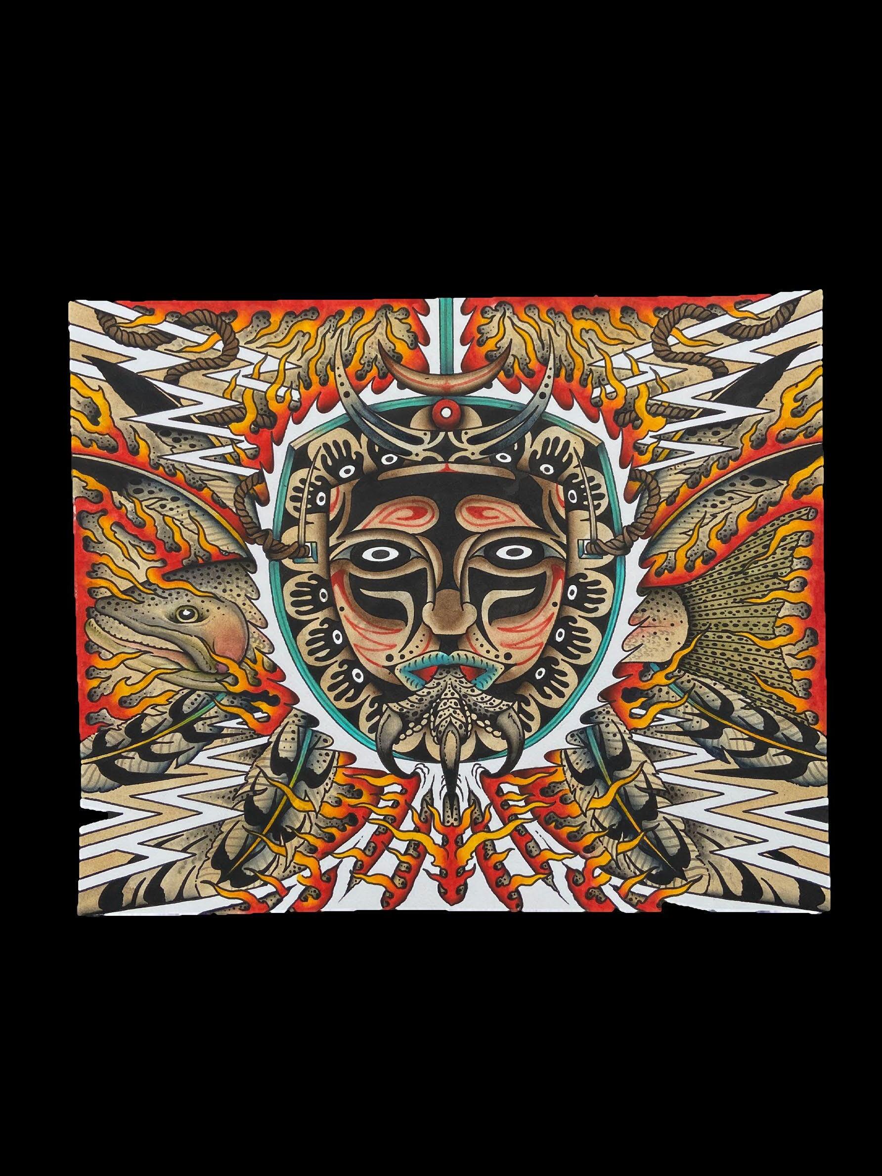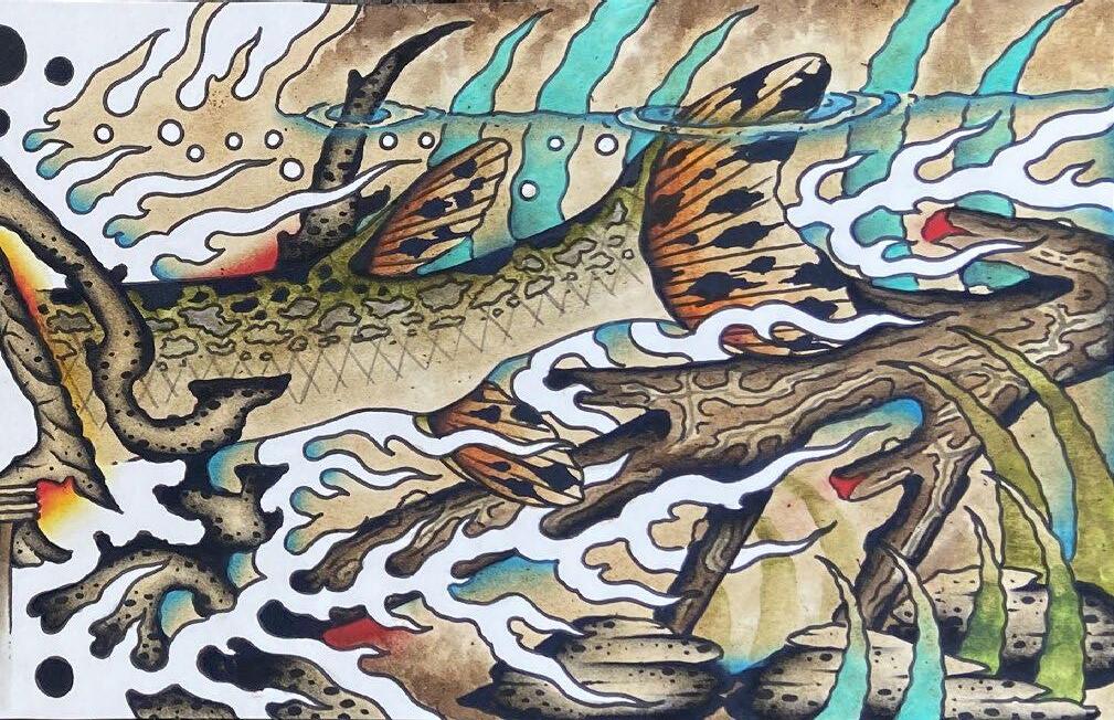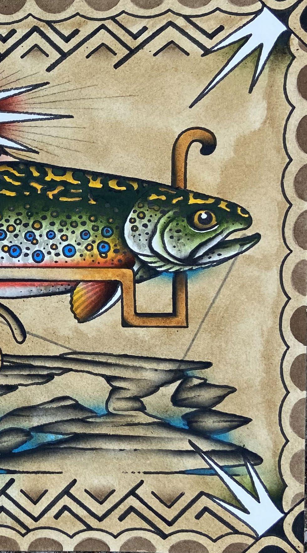 to become a tattooer. For the last 15+ years I’ve been lucky enough to make all my income on tattooing , selling antiques, folk art, and painting. My work relies heavily on my interest in fishing, camping, kayaking, and hunting so I’m thankful to have a job where i do have enough time to fly fish for smallies, musky (when the water temp is cooler) and stripers almost 150 days every year and be able to hunt hard for deer and turkey season. I currently live and work in Bowling Green, KY with my wonderful girlfriend, step son, and all our animals. I book tattoos and accept painting commissions and can be reached at frank armstrong tattoos at gmail dot com