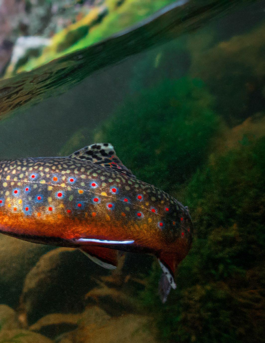 silent ponds in northern New England—are some of the most beautiful landscapes in the eastern United States. One inviting feature of these waters is that they do not suffer the same levels of fishing pressure as lowerelevation streams that are more accessible. It’s common to spend a day completely alone while hiking up a brookie stream, even though you may be only a few hours from urban life along the east coast. During most trips to fish for brook trout, my only companions are brightly colored salamanders, birds in the treetops, and an occasional black bear. These streams are not home to large, blandly colored, hatchery-reared fish. Anglers who hike up to cold trickles appreciate the intangibles that nature has to offer: great views from the tops of mountains, the physical challenge of getting to rugged streams, and the chance to catch colorful native fish. When brookies strike at the end of my invisible leader line, the mountain has bestowed upon me a living gift. Today, brook trout in the eastern United States receive more conservation attention than they ever have, from growing numbers of local, state, and federal conservation and restoration projects. The simple yet understandable desire to catch big fish does not drive this interest. Brookies, in most of their range, are not and never will be big fish. I feel a sense of accomplishment when I catch an eight-inch fish in a headwater stream. The love of native fish and their landscapes is the motivation that largely drives the effort to improve and protect the brook trout's habitat. To me, this is a healthier motivation than managing a species and ecosystem solely for producing trophies.