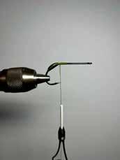 6. Tie in rear legs by pinching the leg tip together around the hanging thread and then while applying pressure to the legs lift bobbin and place legs into their place. This is an easy way to find center. Make 3 or 4 tight wraps to the center then fold over the leg and secure with more wraps. Legs should be even angled to the rear.