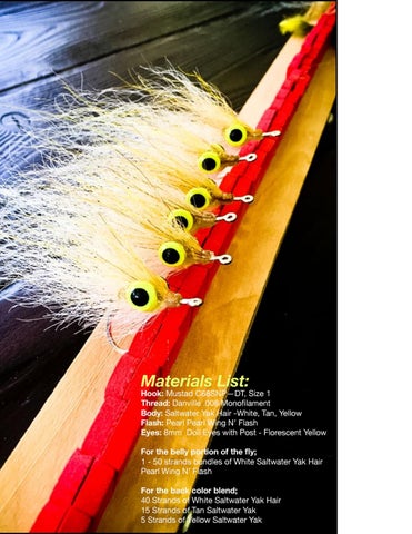 Hook: Mustad C68SNP—DT, Size 1 Thread: Danville .006 Monofilament Body: Saltwater Yak Hair -White, Tan, Yellow Flash: Pearl Pearl Wing N’ Flash Eyes: 8mm Doll Eyes with Post - Florescent Yellow For the belly portion of the fly; 1 - 50 strands bundles of White Saltwater Yak Hair Pearl Wing N’ Flash For the back color blend; 40 Strands of White Saltwater Yak Hair 15 Strands of Tan Saltwater Yak 5 Strands of Yellow Saltwater Yak
