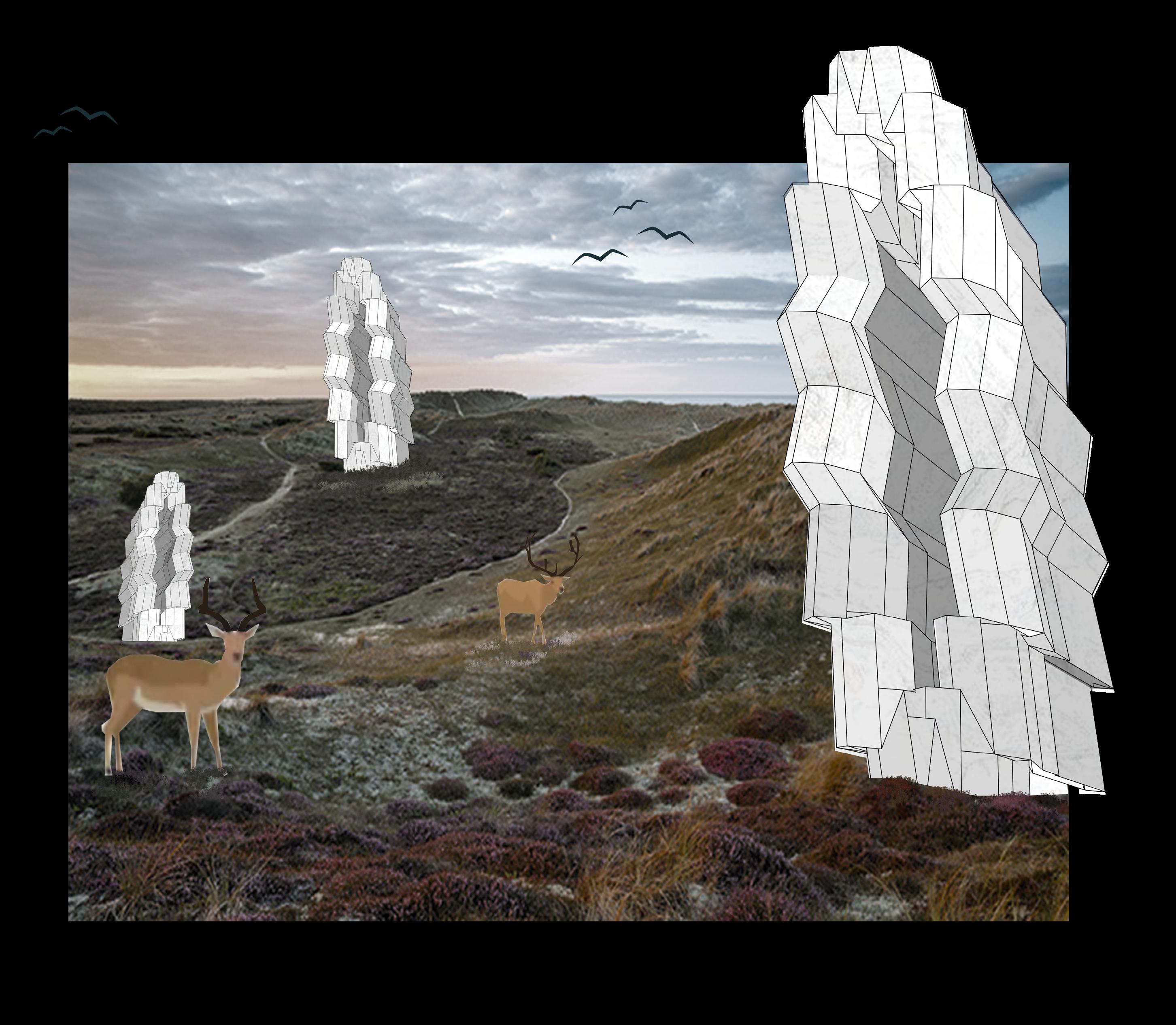 using various 3d modeling techniques in rhino, pebble house adu (so-il, 2021) and tree snake house (luis and tiago rebelo de andrade, 2012) were combined to create an original volume. elements such as context and style were added to create digital collages. environment and mood were produced by the addition of the physical landscape and characters that indicate the scale of the volume. different views and distances were demonstrated throughout the collages.