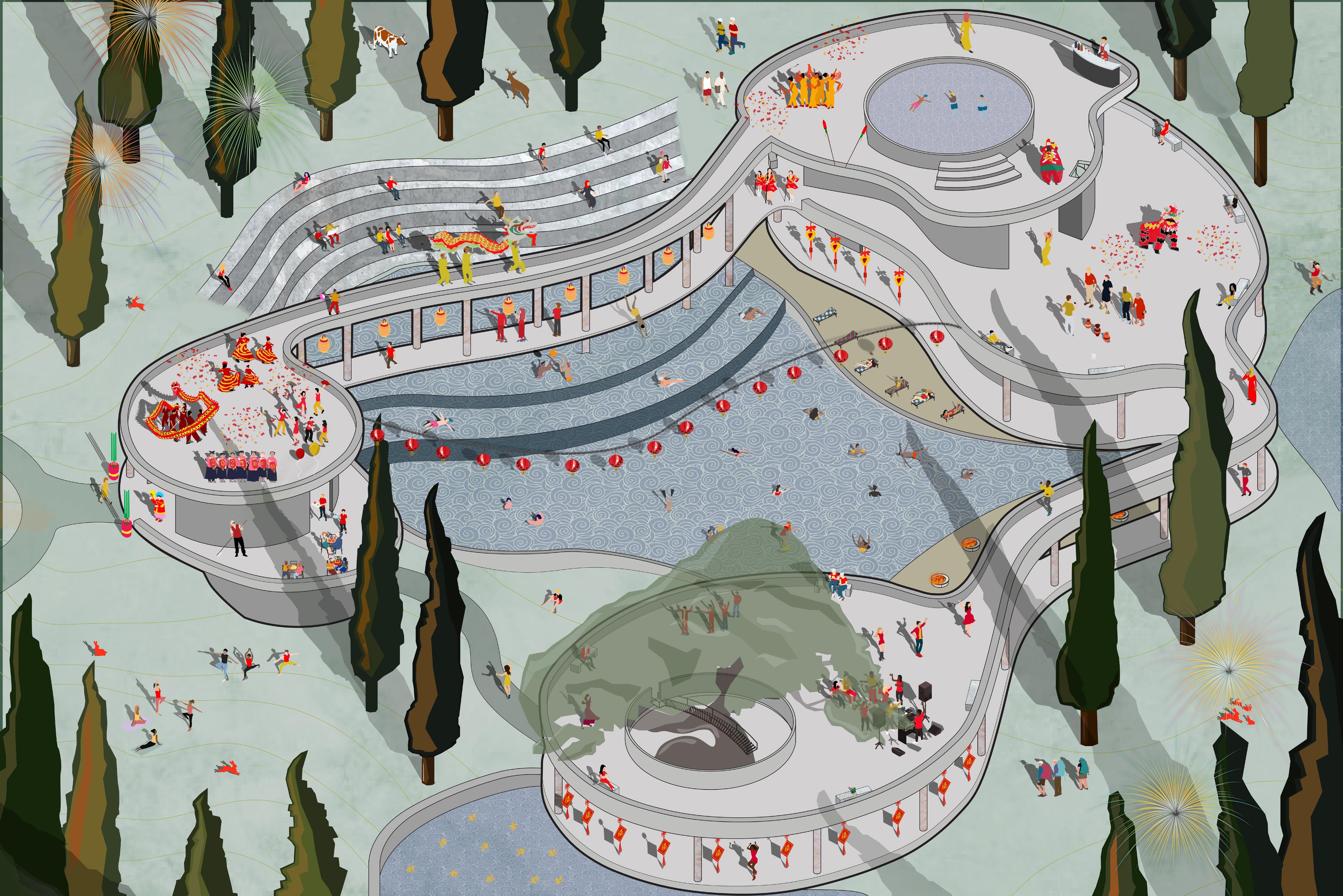 the goal of the project was to design a poolscape that investigates a relational scenario that integrates the pool with a selected theme, the chinese new year. using organic shapes and curves to create the final design, the goal in the design of the poolscape was to establish a choreography, creating a relationship between the building and the landscape. tadanori yokoo’s asahi beer ad and grace farms by sanaa were the primary precedents during the design process. there are 3 primary structures that are connected by open walkways. the first building is a welcome center that includes a terrace for a cafe that it sits atop. the bridge that runs above the largest pool connects it to the 2 story spa center. a set of stairs from the second floor creates an opportunity to occupy the roof as well. the following walkway then connects the spa center to the final pavilion, leading to the pool at the end. the design process included 3d modeling the structure using rhinoceros. after transporting the linework into adobe illustrator, color, texture, figures, and shadows were incorporated. the color palette, as well as the inclusion of different scenes happening throughout the drawings were inspired by yokoo’s asahi beer ad. the end resulted in an axonometric drawing and a section perspective.