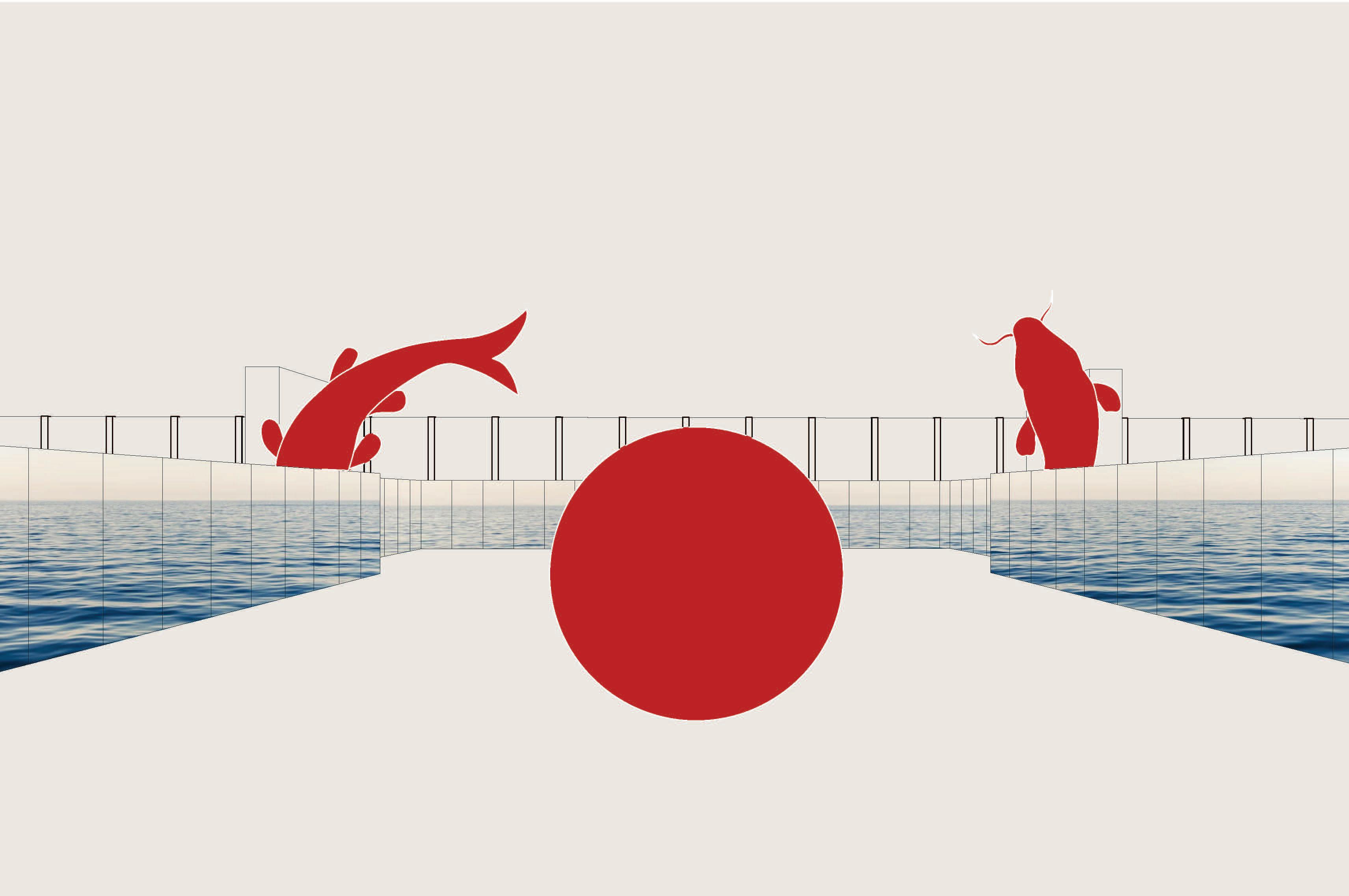 The goal of the project was to design a poolscape that investigates a relational scenario that integrates the pool with a selected theme, the chinese new year. using organic shapes and curves to create the final design, the goal in the design of the poolscape was to establish a choreography, creating a relationship between the building and the landscape. Tadanori yokoo’s asahi beer ad and grace farms by sanaa were the primary precedents during the design process. There are 3 primary structures that are connected by open walkways. The first building is a welcome center that includes a terrace for a cafe that it sits atop. The bridge that runs above the largest pool connects it to the 2 story spa center. A set of stairs from the second floor creates an opportunity to occupy the roof as well. The following walkway then connects the spa center to the final pavilion, leading to the pool at the end. The design process included 3d modeling the structure using rhinoceros. After transporting the linework into adobe illustrator, color, texture, figures, and shadows were incorporated. The color palette, as well as the inclusion of different scenes happening throughout the drawings were inspired by yokoo’s asahi beer ad. The end resulted in an axonometric drawing and a section perspective.