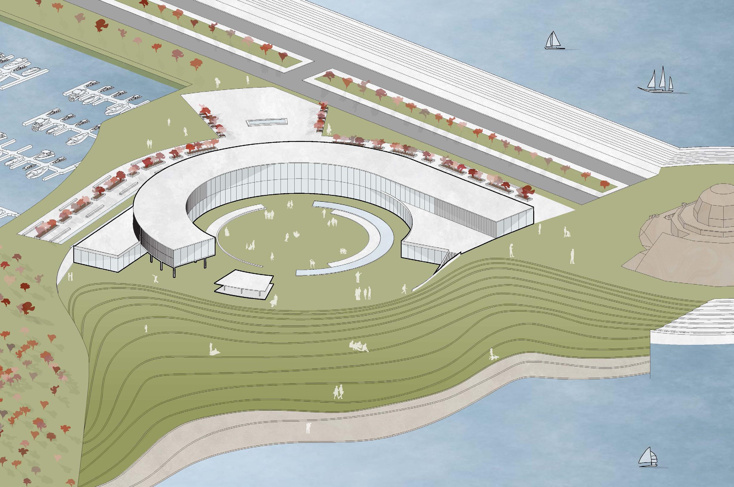 This project is a museum and school of sound and music, situated on Chicago’s museum campus, occupying the space previously designated as a parking lot on Northerly Island. Positioned between Adler Planetarium and the Shedd Aquarium, both monumental landmarks, the building commands its own sense of grandeur. With channel glass adorning the north facade and a curtain wall enveloping the south facade, the primary objective of this structure revolved around transparency and creating an inviting atmosphere. The building has a curved design, with its southern facade opening up to a courtyard that extends towards the rest of Northerly Island.