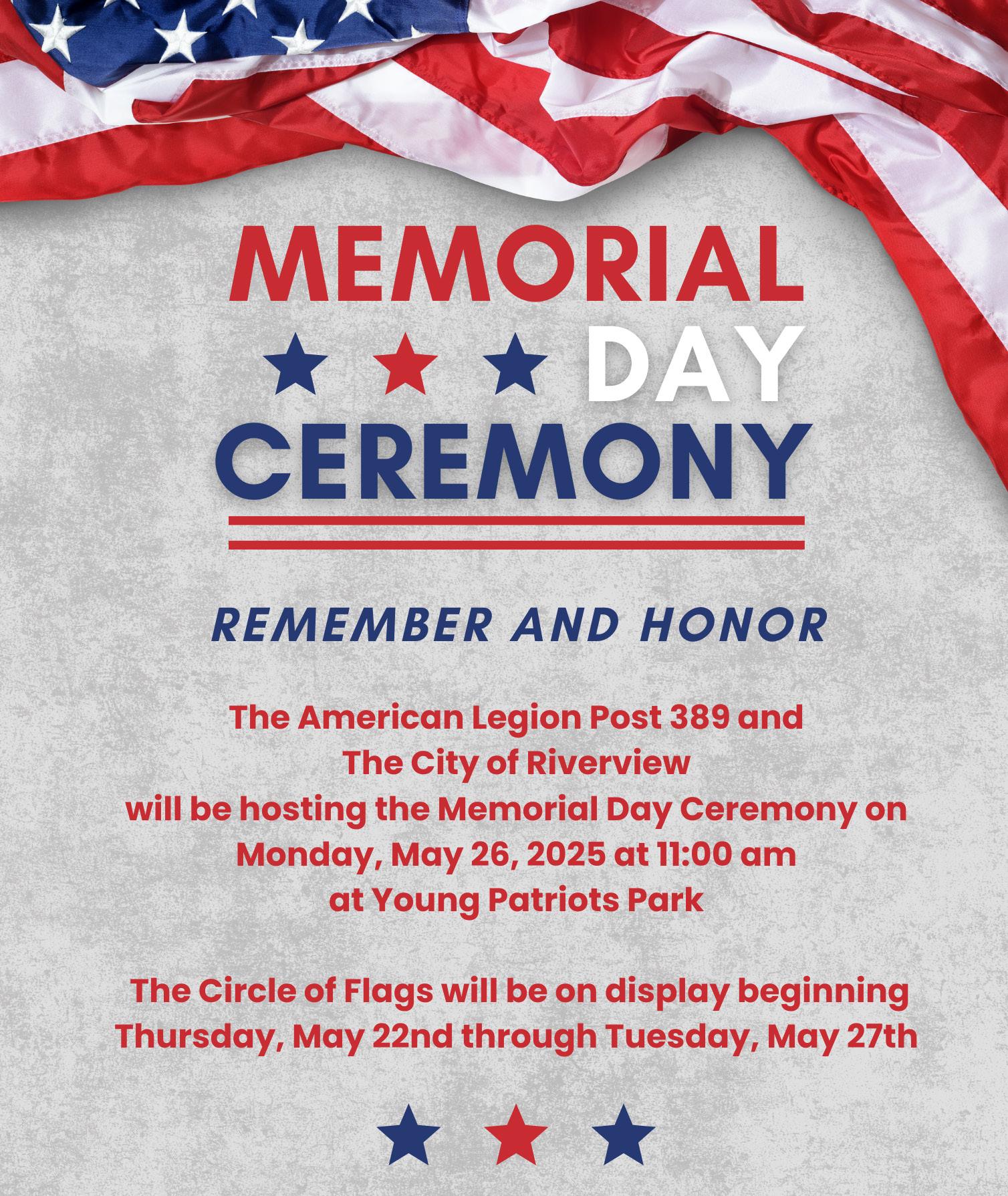 com. There’s a place for everyone, and your time and talents could make all the difference. Looking ahead, don’t forget to join us for the Annual Memorial Day Ceremony on Monday, May 27th at the Riverview Veterans Memorial Library. Hosted by the Riverview American Legion Post #389, the event begins at 11:00 a.m. and features a solemn tribute to those who served, including the traditional arrival of our motorcycle riders who surround the American flag in silent honor.