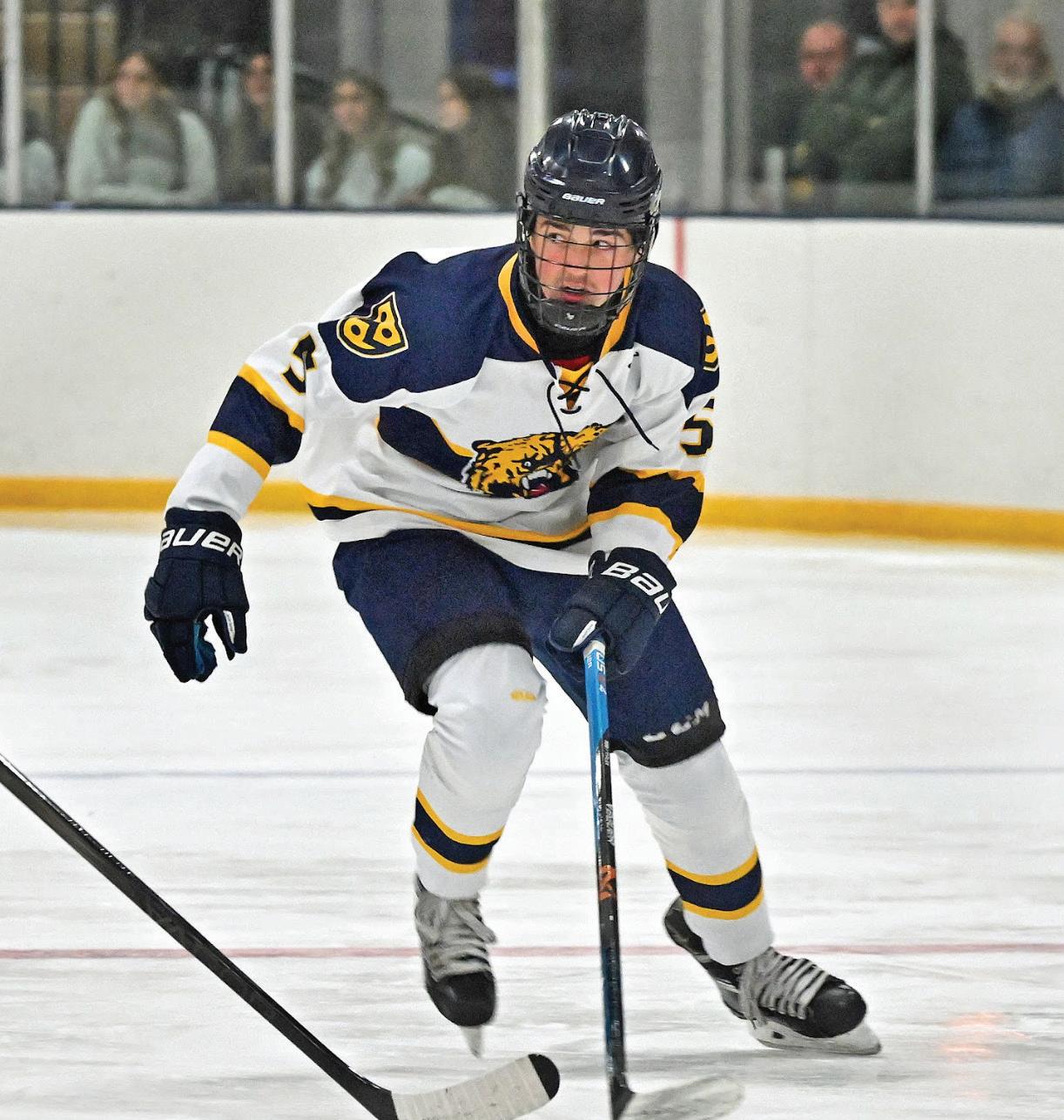 Junior Donovan Durban scored the gamewinning goal on a powerplay early in the overtime. His classmate Landon Leone assisted. Senior goalie Evan Sivi – who stopped 27 of the 28 shots he saw in the game – started the play and he drew the secondary assist.