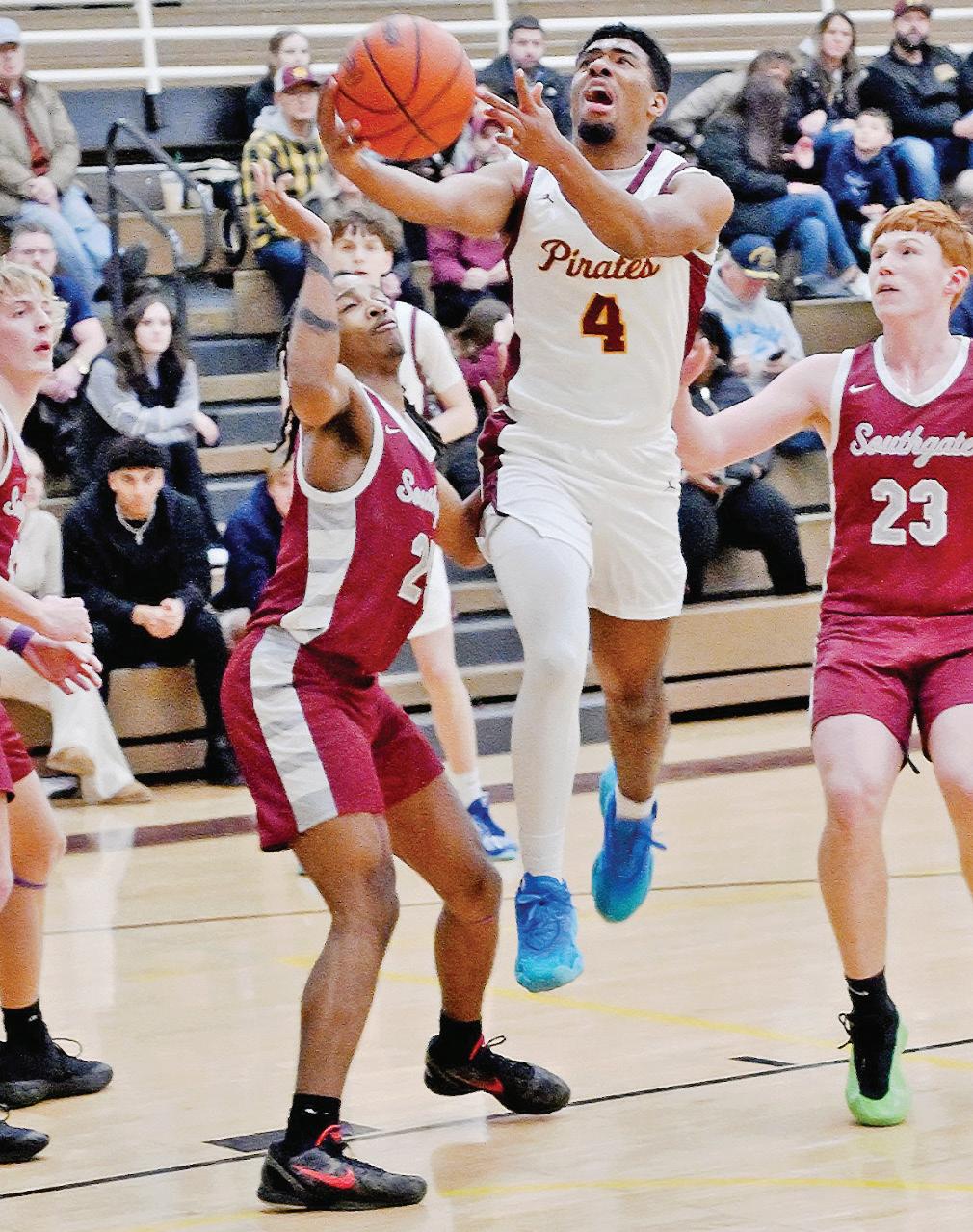 Southgate senior Logan Tatman, who led all scorers in the game with 23 points, scored the first seven points of the fourth quarter on two three-point shots and a two-pointer. It looked like the Titan run might be the difference in the game, but the Bucs still had some bullets left in their guns.