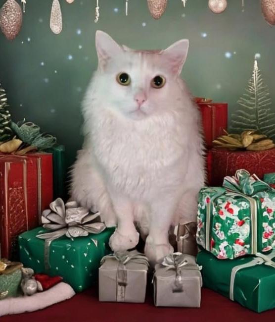 This special Christmas Kitty, Opal, is pictured patiently waiting to open all of her presents from Santa Paws! How many toy mice do you think she got?