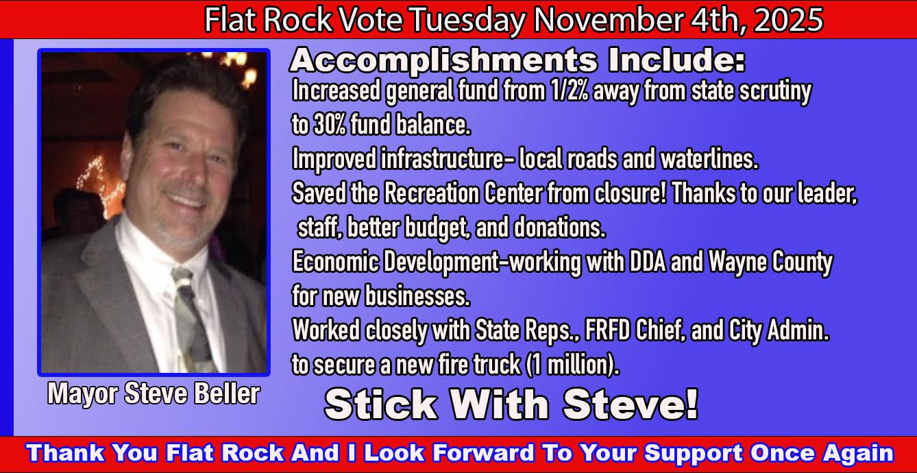now started meetings with both offices on funding from next year’s state budget to replace the wooden playground in Community Park. I would also like to thank our understaffed DPW for the outstanding job they did two weekends in a row, removing all the spray paint graffiti at Huroc Park. Flat Rock Police Chief Stephen McInchak and DDA Director Elizabeth Hendley are formulating a plan to have cameras installed around Huroc Park to help keep an eye on it.