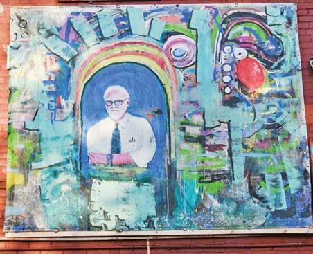 If you walk along the bustling streets of Wyandotte and happen to pass the back side of River’s Edge Gallery, you’ll be greeted by a striking new mural. The mural, unveiled on August 29th, is a vibrant mix of bold colors and abstract patterns depicting a stoic Gilbert Rose standing front and center, framed by swirling colors and energetic brushstrokes surrounding him. His poised, no-nonsense expression, with his neatly combed white hair and glasses, is a beautiful contrast against the chaotic vibrancy of the background — a perfect representation of the man himself.