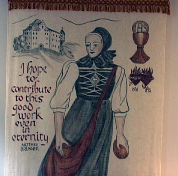 Top (left to right): The grounds of the Sisters of the Precious Blood in Himmelgarten, Ohio. Mother Ludmilla Langenbach, appointed superior of the Sisters of the Most Precious Blood in Oregon. Sister Donna Marie Kessler of the Franciscan Sisters of Christian Charity. Bottom: A stained glass image of Mother Maria Anna Brunner, Foundress of the Sisters of the Precious Blood, at Precious Blood Catholic Church in Dayton, Ohio.