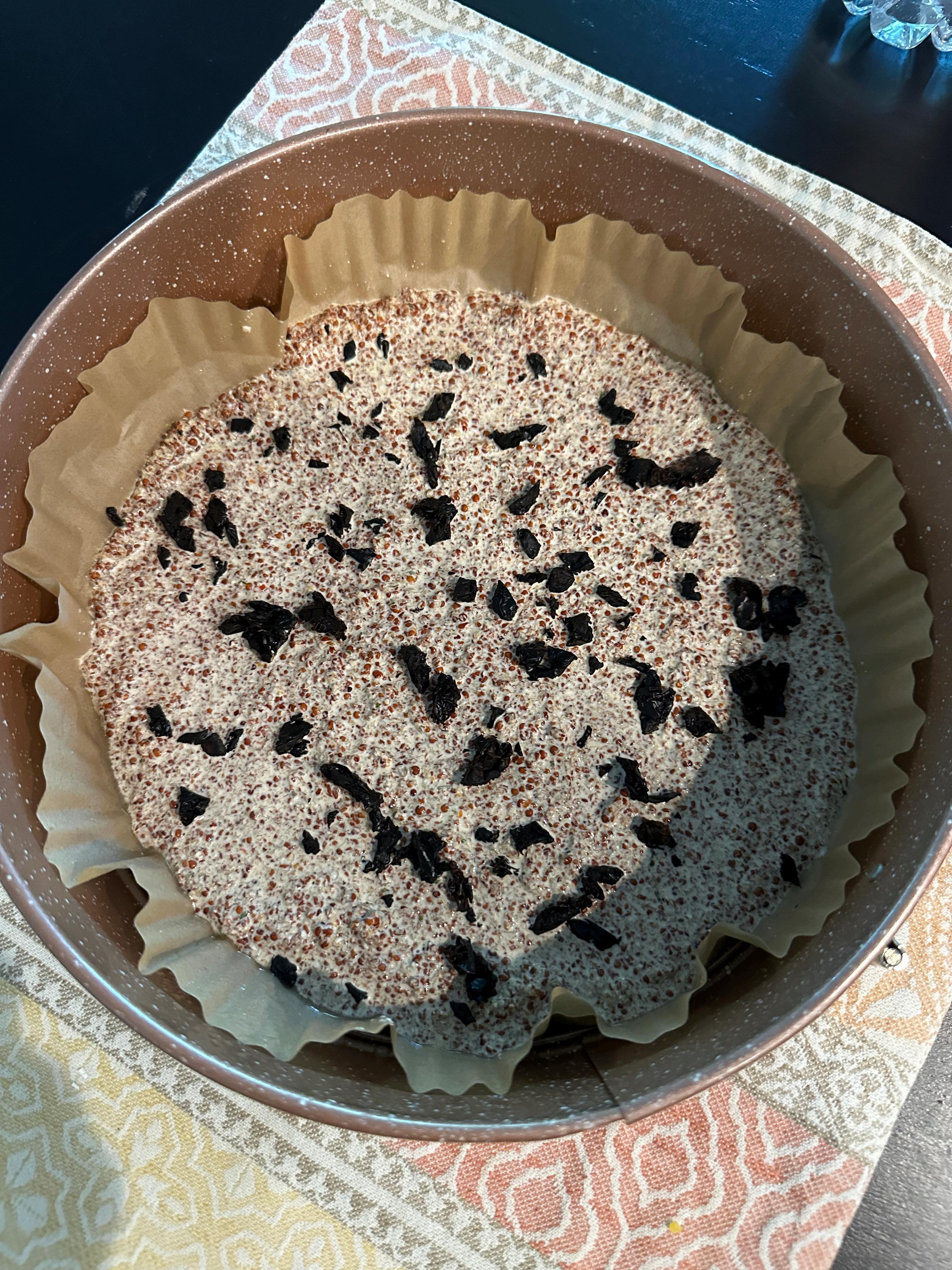 Step Three: In a food processor, blend oatmeal, 6 fat dates or 5 T. date paste, garbanzo, cacao, vanilla, and a splash of plant milk. Process mixture. It should hold together when pinched into a ball. If too crumbly, add another splash of plant milk. Line a pie plate with the crust. It should press in and form an even crust.