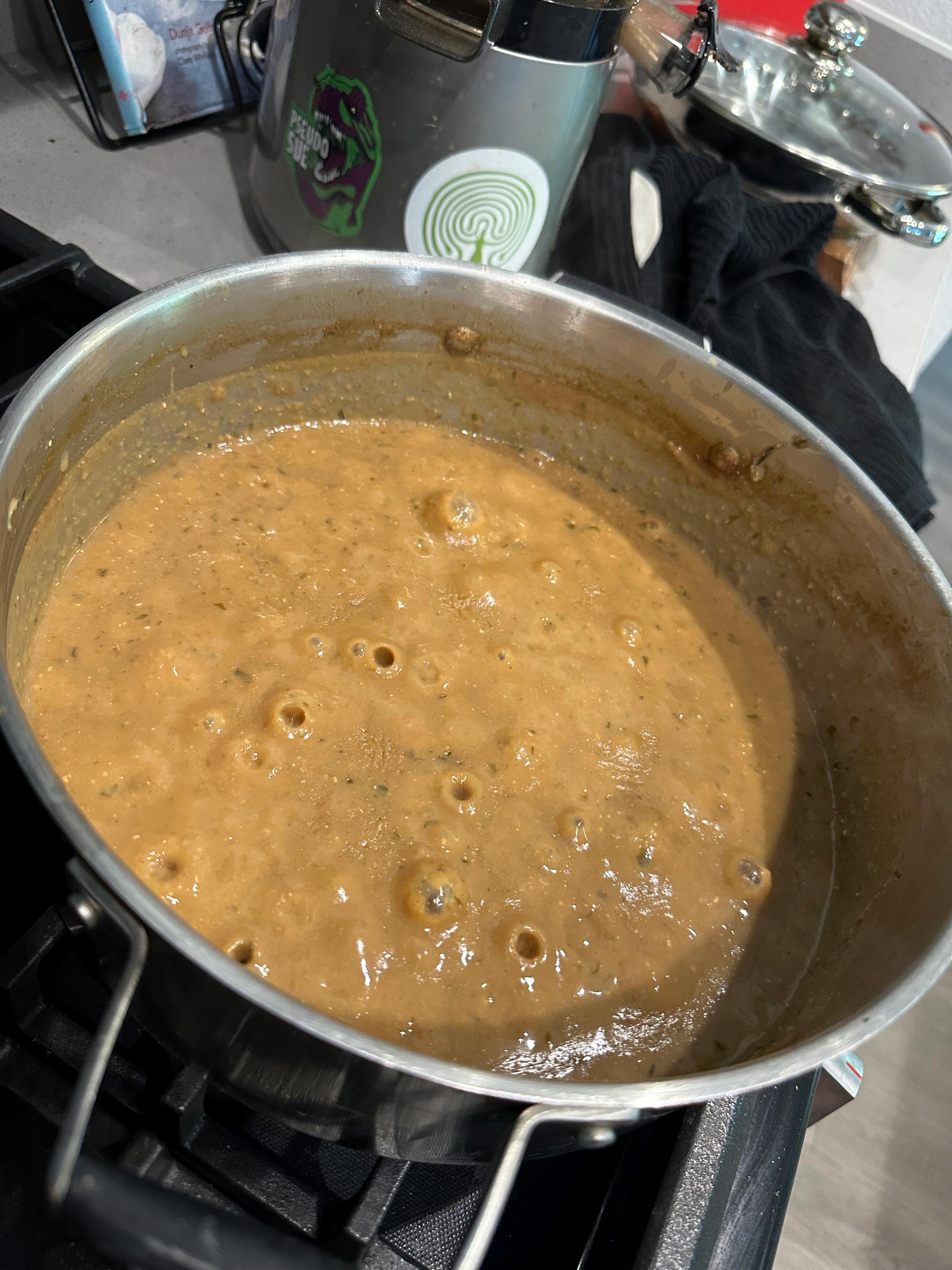 Step One: In a non-stick pot, add the minced mushroom and cook for a couple of minutes until it releases water. Add the rest of the vegetables. Cook to soften, for a couple of minutes. stirring to prevent sticking and to integrate the browned bits. Splash in the balsamic to deglaze the pan.