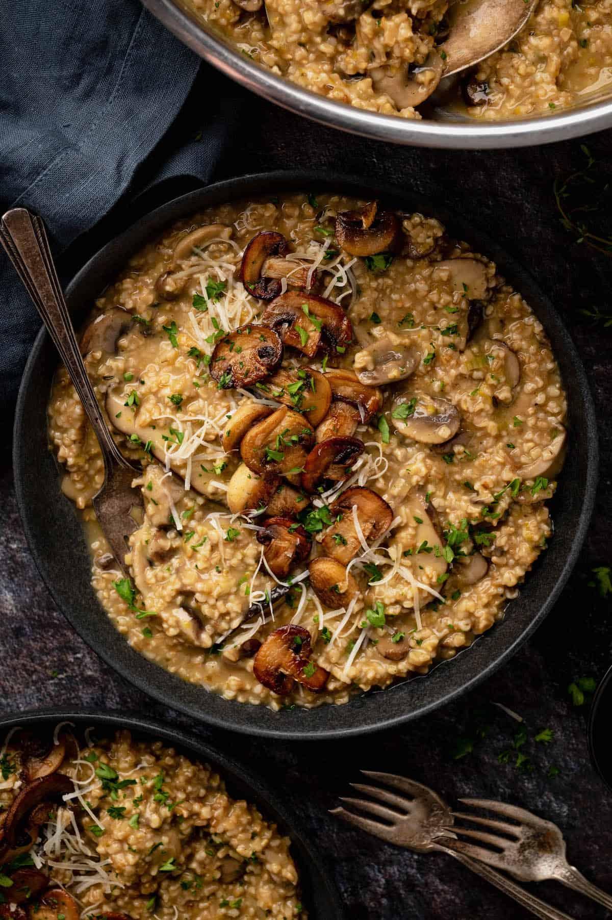 Oats can be cooked into a savory dish, for breakfast, lunch, or anytime. Steel cut oats are a good source of iron and plant protein, and they have a dense, chewy texture and nutty flavor. Because they're minimally processed and the least processed version of oat groats, they're considered one of the healthiest grains you can eat.