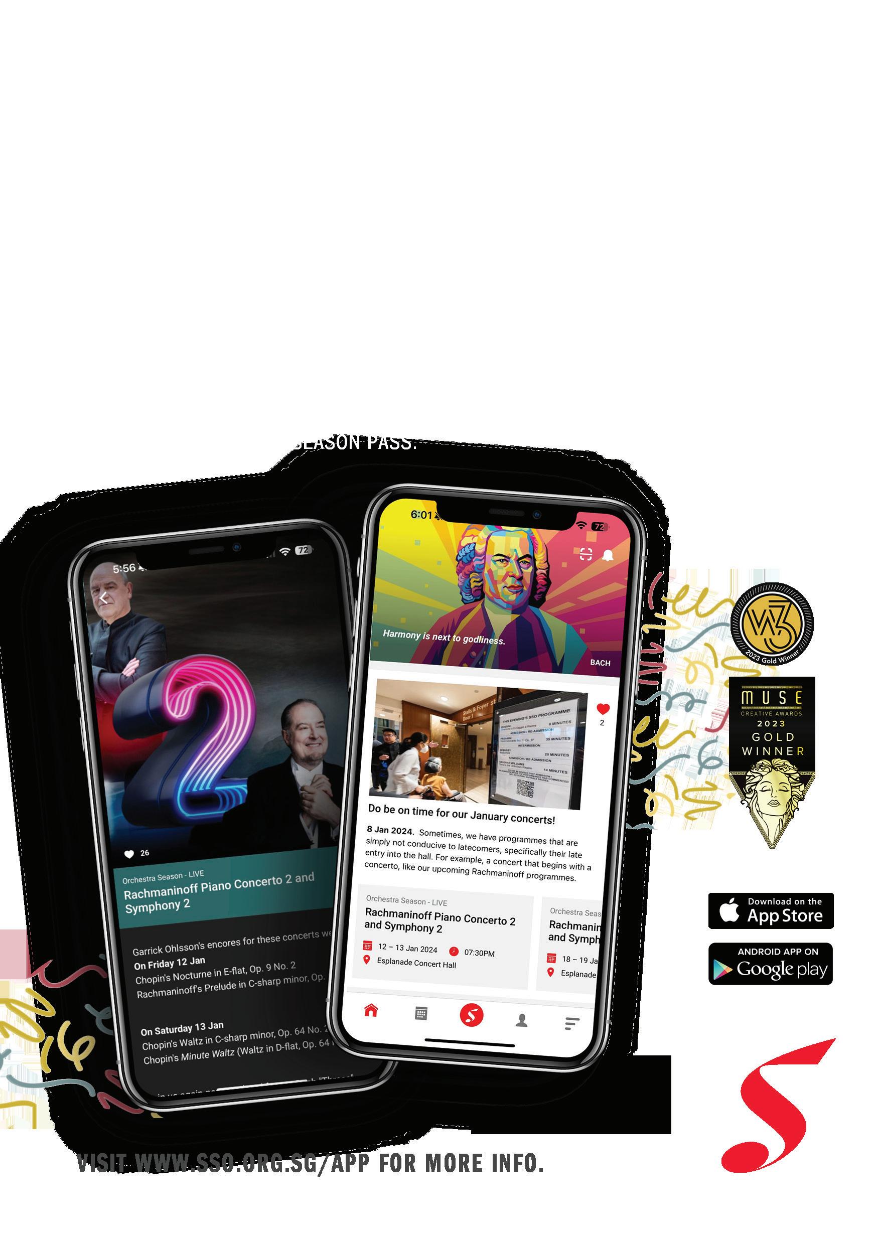 The vision of the Singapore Symphony Group is to be a leading arts organisation that engages, inspires and reflects Singapore through musical excellence. Our mission is to create memorable shared experiences with music. Through the SSO and its affiliated performing groups, we spread the love for music, nurture talent and enrich our diverse communities. The Singapore Symphony Orchestra is a charity and not-for-profit organisation. You can support us by donating at www.sso.org.sg/donate