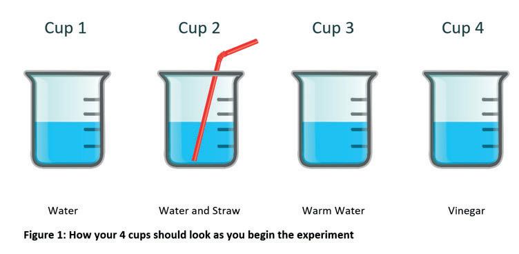 halfway. Cup 1 should have water. Cup 2 should have water and a straw. Cup 3 should have warm water. Cup 4 should have vinegar.