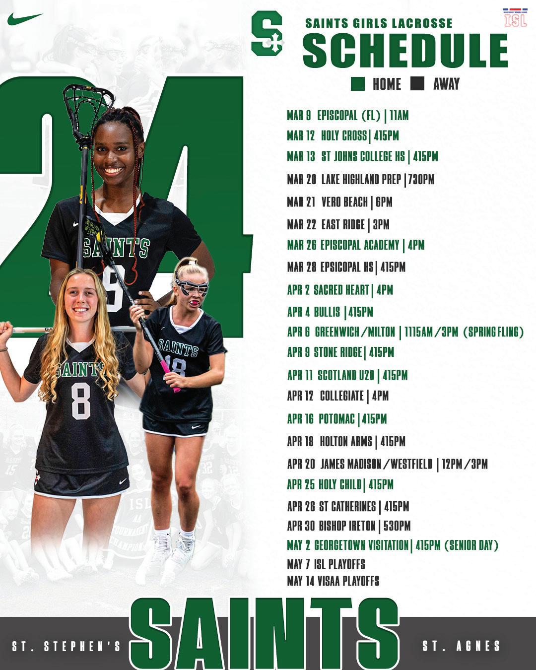9:30 AM Good Counsel vs Grass Field Stone Ridge Potomac vs Upper Field St. Anne’s-Belfield Loyola Academy vs Lower Field Georgetown Visitation 11:15 AM St. John’s College HS vs Grass Field Collegiate SSSAS vs Upper Field Greenwich Academy St. Paul VI vs Lower Field Milton 1:00 PM Good Counsel vs Grass Field St. Anne’s-Belfield Potomac vs Upper Field Loyola Academy St. Paul VI vs Lower Field (1:30 PM) Stone Ridge 2:45 PM St. John’s College HS vs Grass Field Georgetown Visitation Greenwich Academy vs Upper Field Collegiate SSSAS vs Lower Field (3:00 PM) Milton St. Stephen’s and St. Agnes School, Alexandria, VA 2024 Spring Fling Girls Lacrosse Tournament | Saturday, April 6, 2024